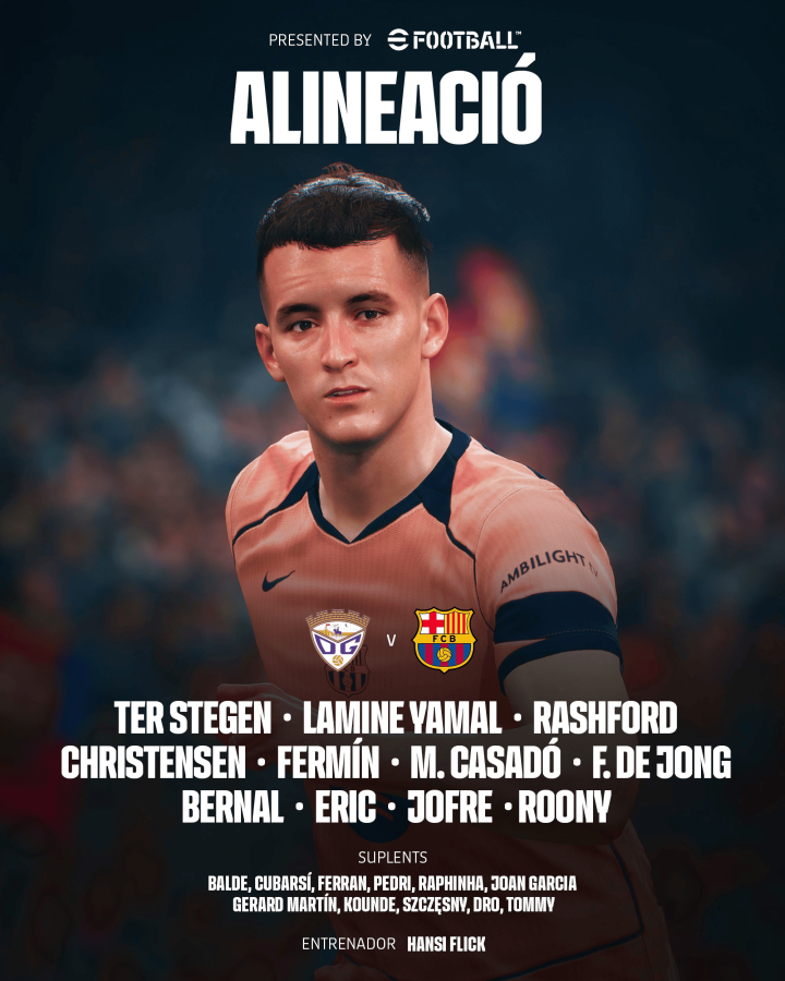 巴萨首发:1-特尔施特根/17-卡萨多、24-埃里克-加西亚、15-克里斯滕森、26-乔弗雷-托伦茨/22-贝尔纳尔、21-德容、10-亚马尔/28-巴尔德吉、16-费尔明、14-拉什福德